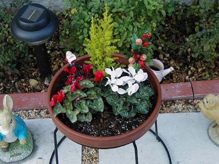 | 赤と白のガーデンシクラメンとミニコニファーを寄せてみました。 飾り付けでクリスマスらしくなったかなー? |