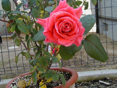 | サーモンピンクのバラですが、枝が細いもので、たれさがtってしまってます。 | |