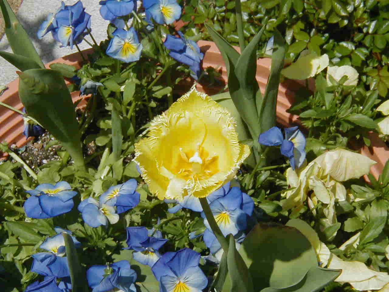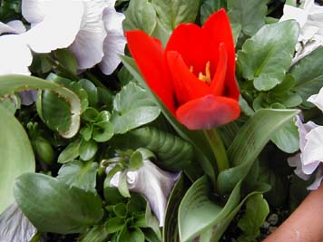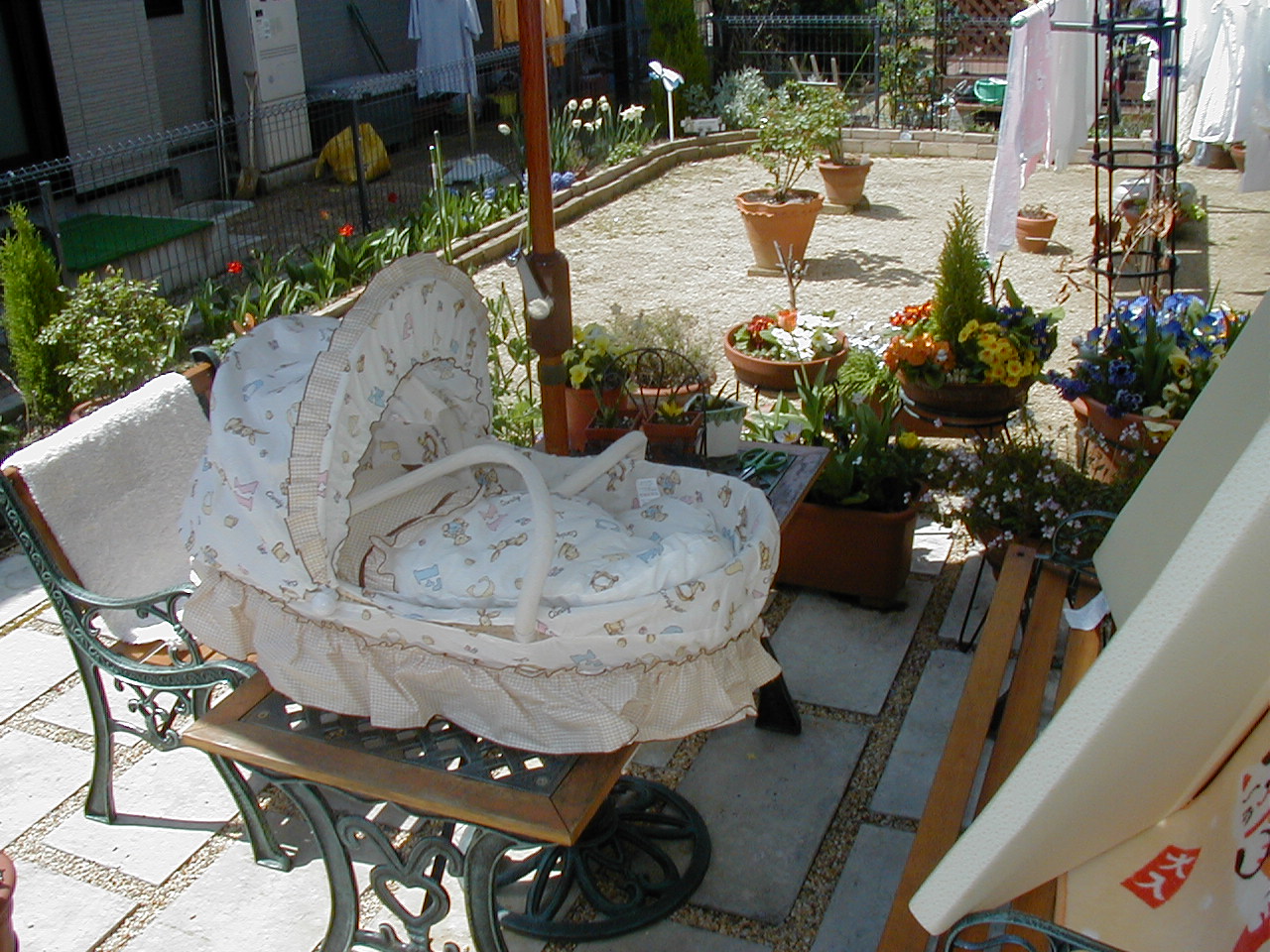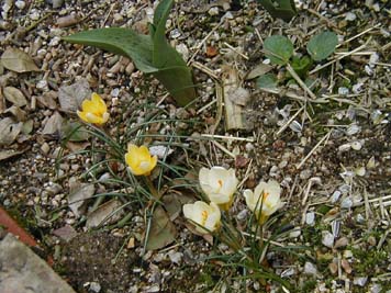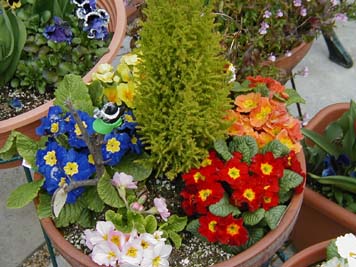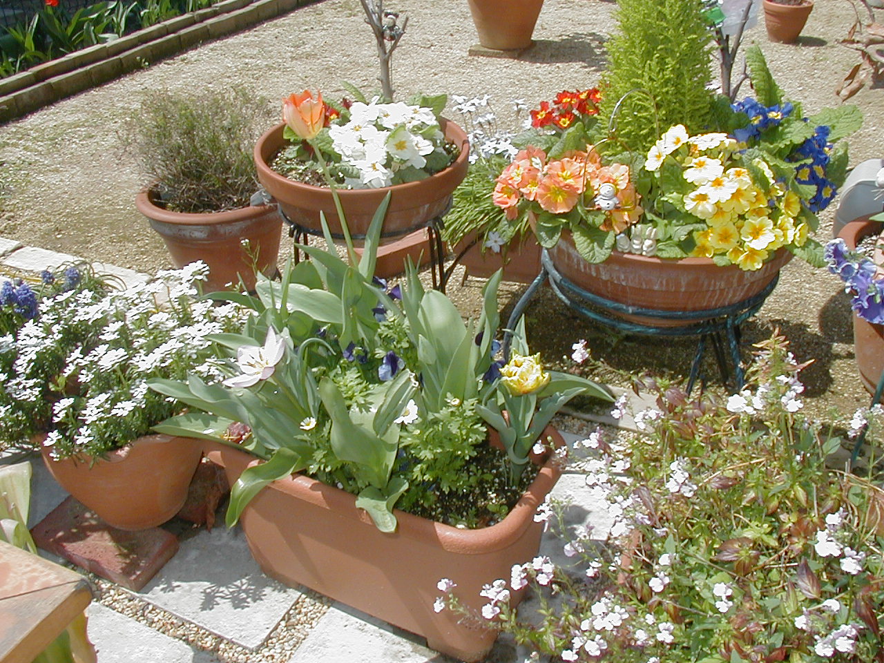 | 2月上旬の桜草です。1月に植えて、ビニールで霜よけをかけてそだててました。 | カップ咲きの「親指姫」です。3/21に咲きました。ウチの庭で一番最初に開いたものです。 | |