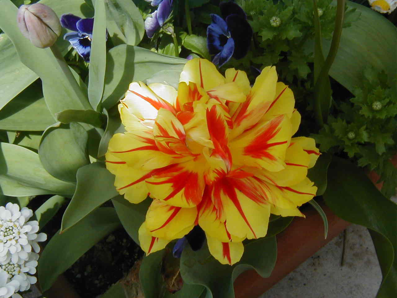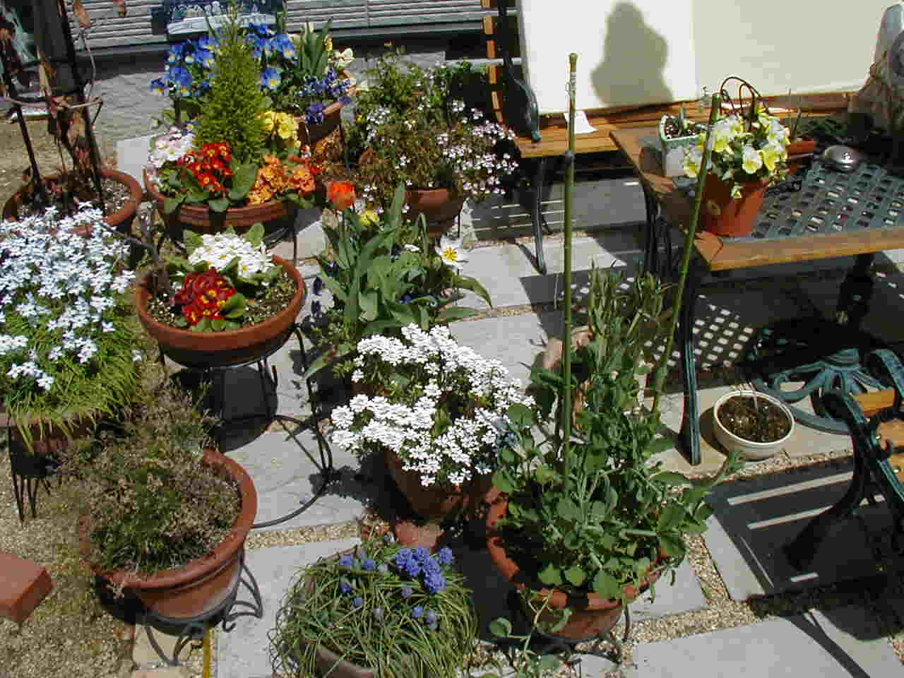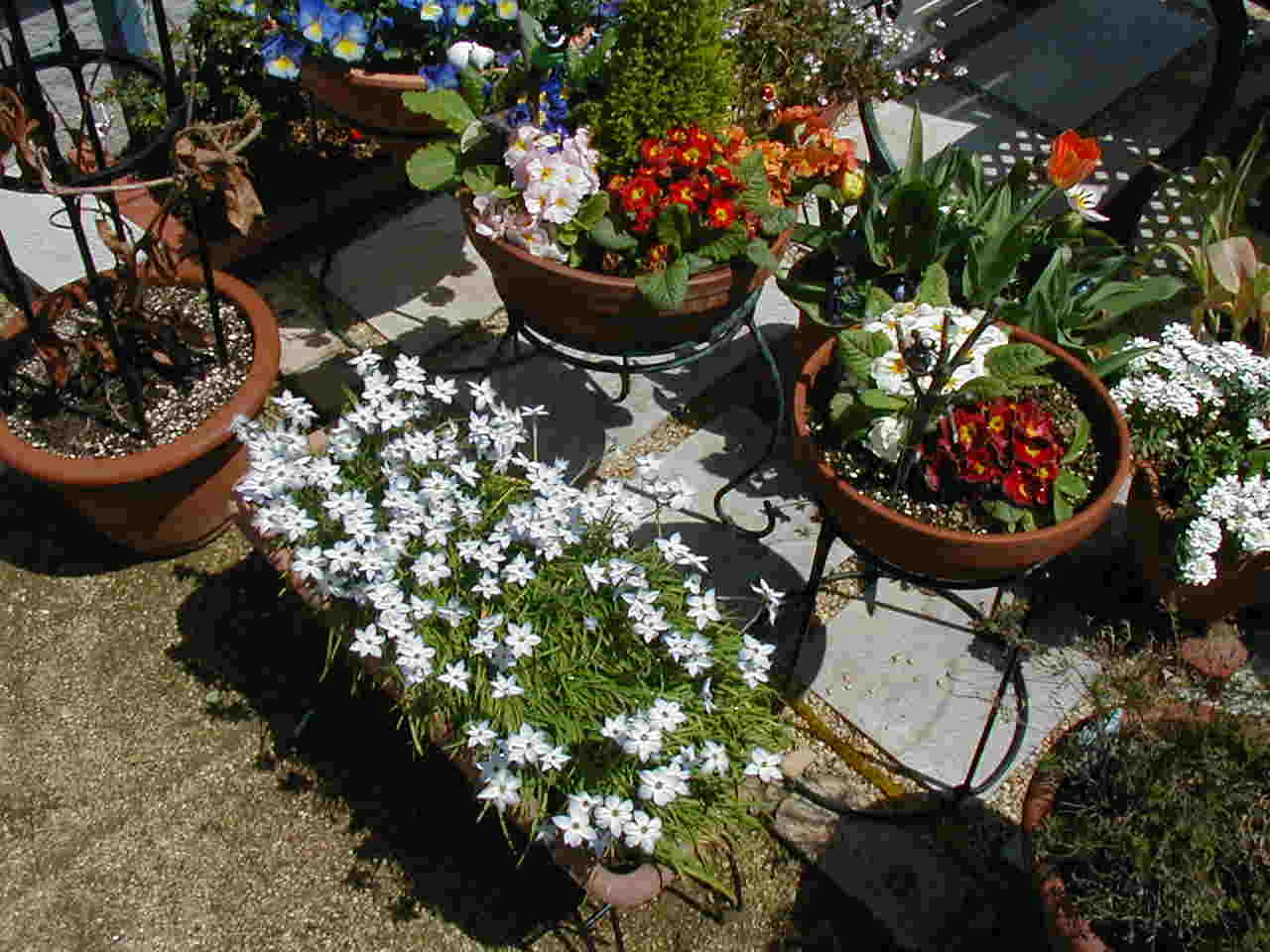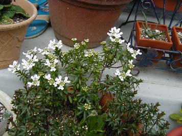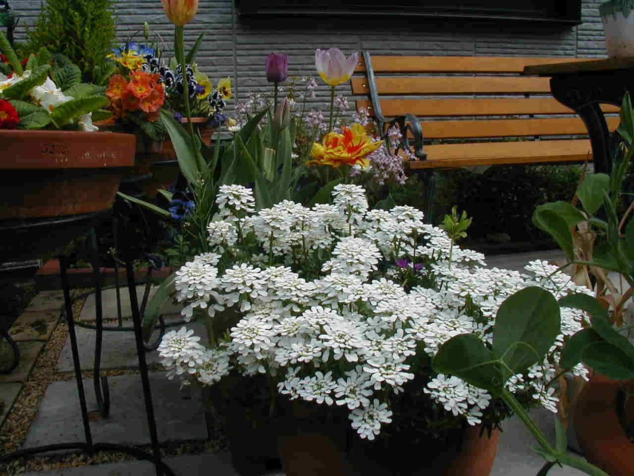 イベリスもこっそりさいてくれてました。 コンテナ・鉢植えのものは、テラスの上に並べてあって、日当たりと温度の条件がなんとかいいようで、早めに咲いてくれてます。 |