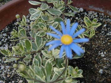 | 2月下旬から咲き出したクロッカスです。 | 斑入りのブルーデージーです。 昨年の夏にコガネムシの幼虫にやられてしまったので新しく買い足しました。 |