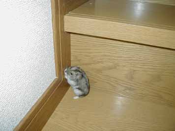 | 掃除の間に逃げ出したチュウ二郎階段を降りる | 降りたのいいが登れない・・・・・・ | |