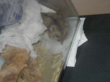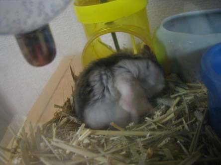 | 最近(7月)あついもんで、藁が邪魔みたいです。 | 昼間は保冷材をひいてあげるとその上で寝てます。 | |