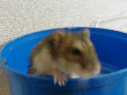 | 最近あそんでほしいと蓋をかじってアピールするようになった・・ 蓋の穴はひろがってるが、プラスティックの削りカスがみあたらない・・・ |