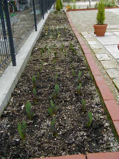 この花壇は冬になると全く日が当たらず,4月になって朝の2・3時間当たるだけの花壇です。