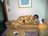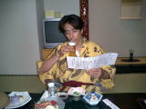 お風呂にはいって中庭をぶらぶらしながら涼んで、風呂をあがってから10歩ぐらいあるくと中庭におりるところに畳をはった縁台みたいな感じのところがあって、風鈴と川のせせらぎの音をききながらそこで一服。風呂上りの快適な一時を満喫しました(時間をわすれさせてくれました)。