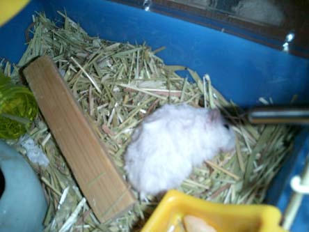 | 8.2の22時頃飼い主がりんごをあげにいったときはまだ歩いて食べにきたようですが、梅猫が1時頃にえさをあげようとしたらぐったりして顔をもちあげただけでした。 いつもなら、えさ替えのためゲージをあけるとすぐ脱走して、部屋中ちょこまか走り回って、梅猫のところへよってくるさんぞうがゲージの隅っこで、顔を持ち上げ、梅猫の方をちらっとみただけで・・・・ 去年は涼しいリビングで過ごしてたさんぞう君ですが、今年はミクがリビングや和室を占領してるので、梅猫の書斎に引っ越したのですが、なんせ暑いもので、ばてちゃったのかな・・ そういえばこの2〜3日食べるえさの量がへっていました・・・ |