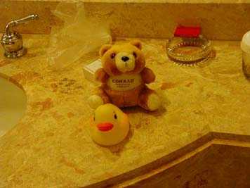 ナイトサファリを見終わって、宿泊ホテルであるコンラッドへ。梅猫はコンラッドがお気に入りで、マリーナ地区での買い物の便利さと、ホテルのプレゼントがお気に入りだとか・・・(梅猫は、前にいったときはクリスマスシーズンだったので、熊がサンタさんだったのにと嘆いてました)