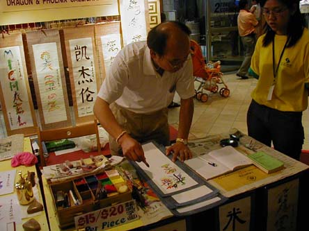 1Fで中国の雑貨や似顔絵、お茶の出店があり、僕たちは龍文字を15シンガポールドルで書いてくれるコーナー?で綺麗にかいてくれるなーと思いながらみてると、文字を書いてるおじさんが、いらっしゃいと日本語で声をかけてくれました。梅猫はつい「一枚かいてください」と・・・・・