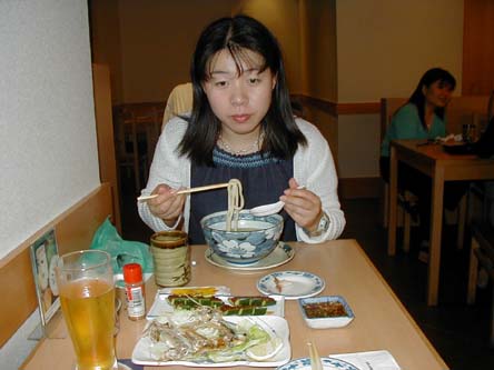 飼い主は天ぷらうどん・梅猫はビール(お店のおねえさんがキリンビールあるよーって言うんでつい・・・)とモロキューとかまの塩焼き。